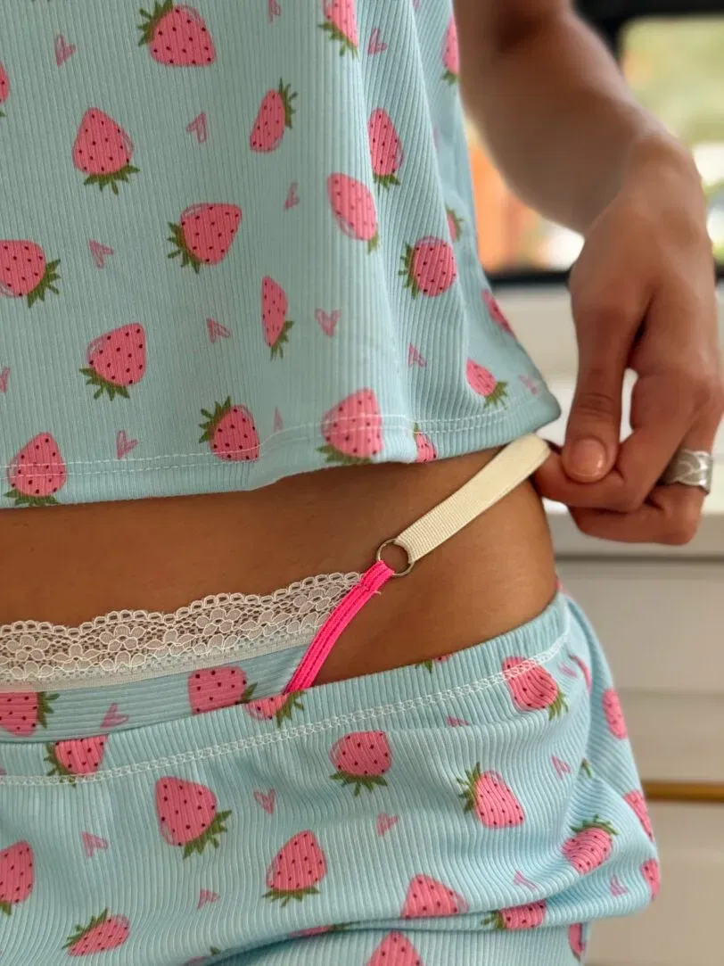 Una combinación irresistible de dulzura y sensualidad. Berry Kiss fusiona una base celeste suave con delicados estampados de frutillas y detalles en encaje que aportan un aire romántico y juguetón.