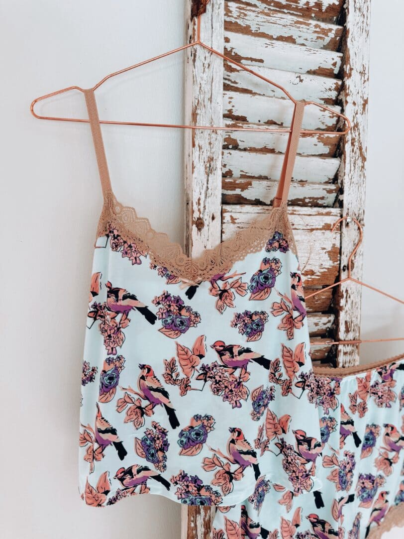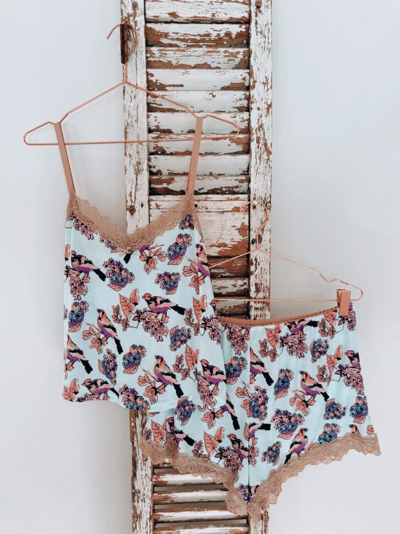 Liviano, suave y esencial.Dos piezas en algodón con efecto seda fría y delicados detalles en puntilla.